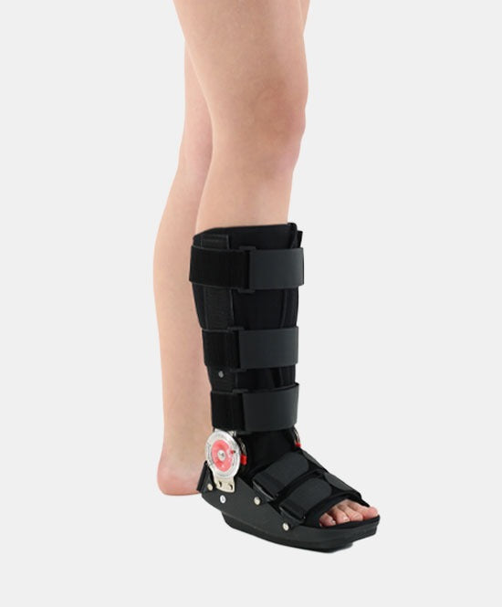 هيكل خارجي صلب مع نعل EVA وبطانة قماش مناشف مريحة. يتيح ضبط الثني الأخمصي والظهري عند درجات: 0° / 7.5° / 15° / 22.5° / 30° / 37.5° / 45°. قاعدة Rocker تدعم نمط المشي الطبيعي وتُسهّل الحركة خلال التأهيل.