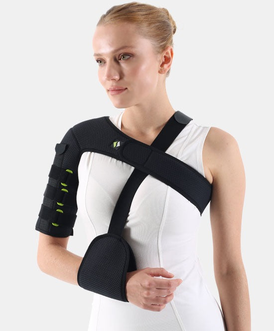 دعامة للعضد ببطانة قماش مناشف مريحة على الجلد وقماش إسفنجي متين، مزوّدة بدعامات داخلية من البلاستيك والألومنيوم لتثبيت العضد وحمايته. تُضبط الدعامات لتتلاءم مع قياسات الكتف المطلوبة وتساعد على الحدّ من الحركة غير المرغوبة وتخفيف الانزعاج خلال فترة التعافي. يتوفر ملحق حمّالة ذراع اختياري لزيادة الثبات عند الحاجة.