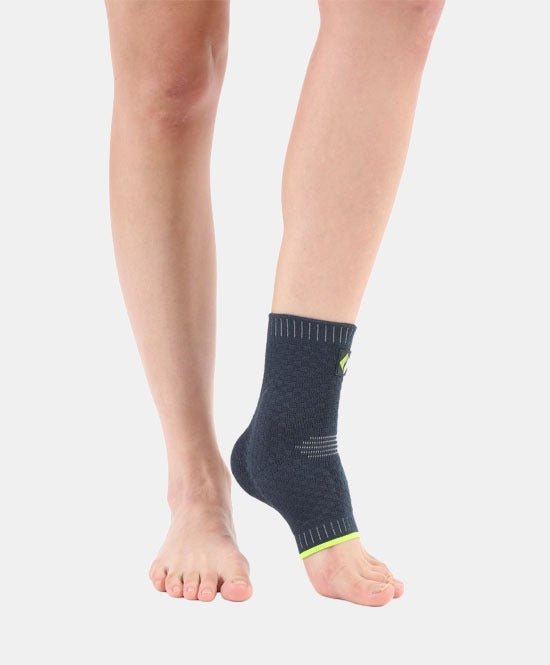 نسيج محاك ثلاثي الأبعاد مع وسادات سيليكون حول الكعبين الداخلي والخارجي لامتصاص الضغط وتحسين الثبات الجانبي. يمنح ضغطًا مريحًا يقلل الألم والوذمة مع راحة عالية أثناء الارتداء.