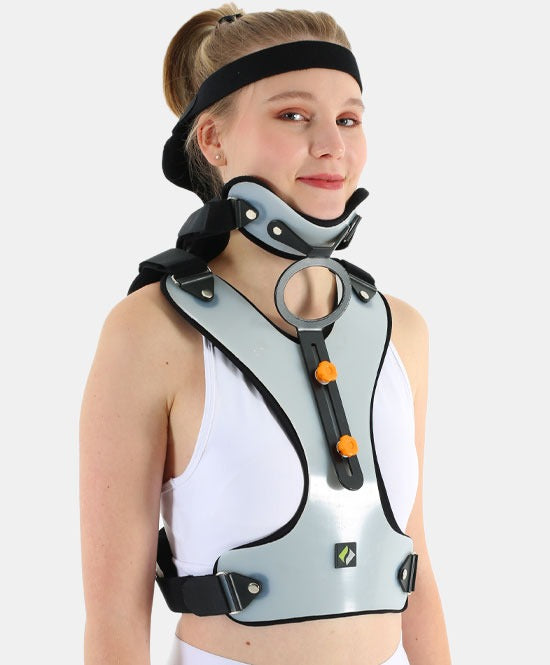دعامة متعدّدة الأجزاء تغطي العنق وأعلى الصدر لتقليل الحركة غير المرغوبة ودعم الثبات في الوضعية المطلوبة. مصنوعة من بلاستيك بولي إيثيلين مع بطانة قماشية مريحة للجلد. يتيح نظام الضبط التحكم بزاوية الانثناء والتمدد (Flexion/Extension) بدقّة للمساعدة في الاستقرار خلال فترة التعافي.