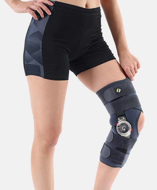 نيوبرين مريح مع هيكل زاوية متغيّرة وأذرع ألومنيوم مبطّنة يسمح بالتحكم التدريجي في ROM للثني والمدّ خلال التأهيل بعد العمليات/الإصابات.