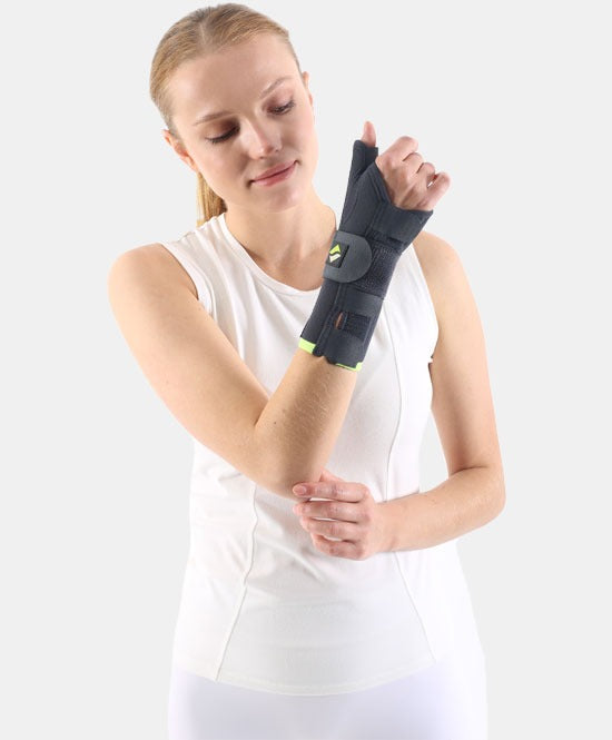 دعامة مصنوعة من النيوبرين تتوافق تشريحيًا مع المعصم والإبهام لتقديم ضغطًا متدرّجًا يخفّف التورّم ويعزّز الراحة. تتضمّن سنادة راحية ألومنيوم للمساعدة على تقييد حركة المعصم والإبهام ووضعهما في وضعية مريحة أثناء التعافي، مع حزام محيطي يعزّز الثبات حول المعصم.