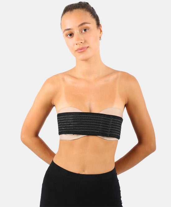 حزام مرن ناعم بإغلاق فيلكرو يُستخدم بعد تكبير الثدي لتثبيت الزرعة ومنع الانزلاق والحفاظ على الوضعية الصحيحة طوال فترة التعافي.